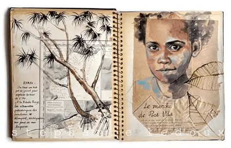 Matériel : Carnet avec couverture en toile, aquarelles, toiles, papier cansons, acrylique, pinceaux fins, crayons aquarellables, colle, vieux papiers pour collage.